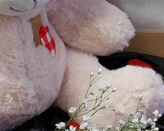 A cute and cuddly patch heart teddy, delivered in a gift box decorated with artificial rose petals with 2 fresh large headed red roses tied with gypsophilia and a garden rose scented soy candle tin