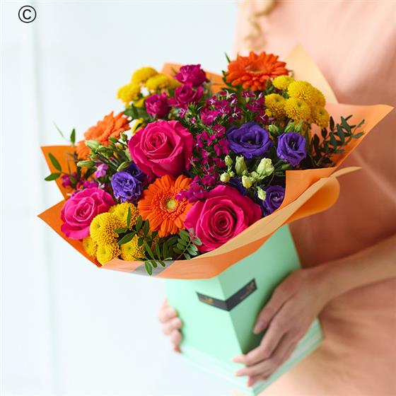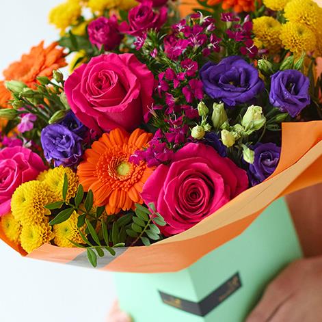 A bright mix of seasonal flowers presented in a giftbox
