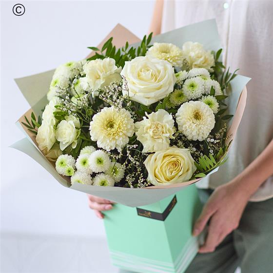 Hand-tied flowers expertly arranged and perfectly presented in a pretty gift box. Each and every design is one-of-a-kind, created by an artisan florist using the freshest stems available on the day so, whilst your gift will look different to the one pictured, it’ll still be just as lovely.