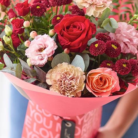 A gorgeous mix of romantic blooms including a red rose, presented in a Valentines themed Giftbox