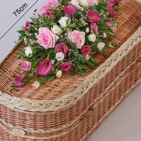 The pink roses and calla Lily in this sweet spray look beautiful arranged with pink lisianthus and limonium with delicate foliage 75cmx30cm