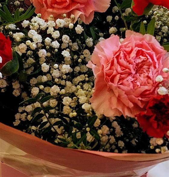 A simple tied bouquet of all mixed carnations , gypsophilia and foliage, delivered in kraft paper packaging and a water bubble